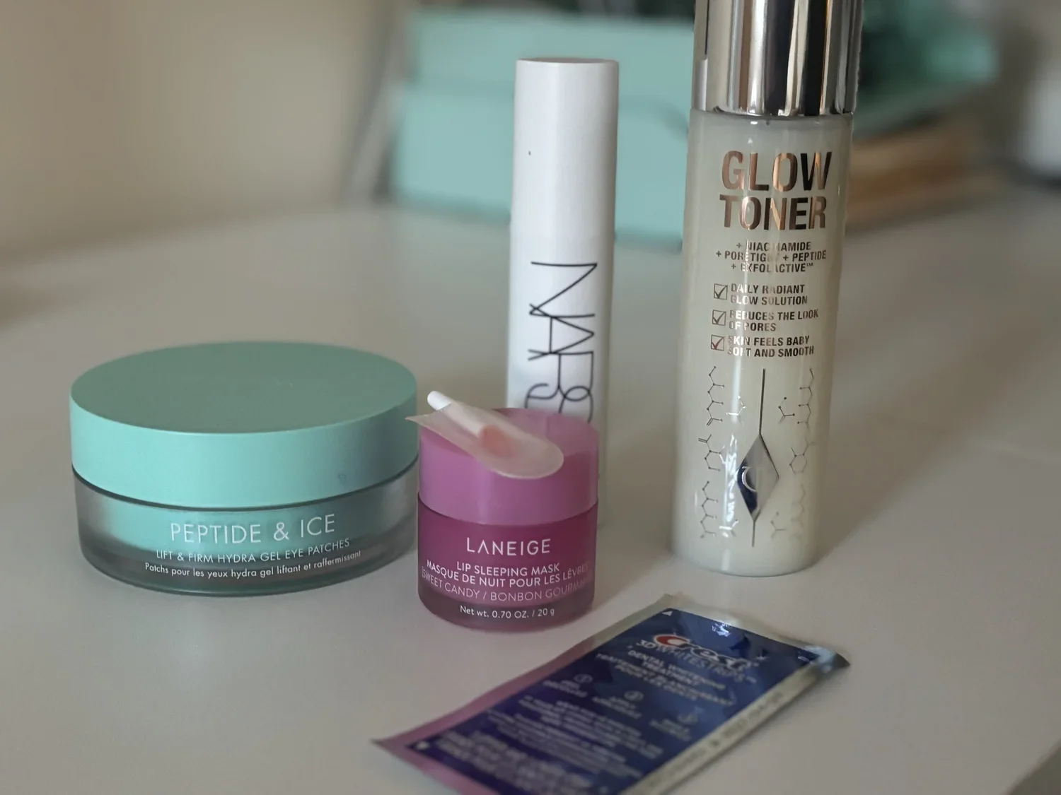 The Crest strips and Laneige are mine. But my tutor explained that the skin prep takes a little time. Why not soften the lips and whiten the teeth while waiting for the Peptide & Ice patches to take effect?
